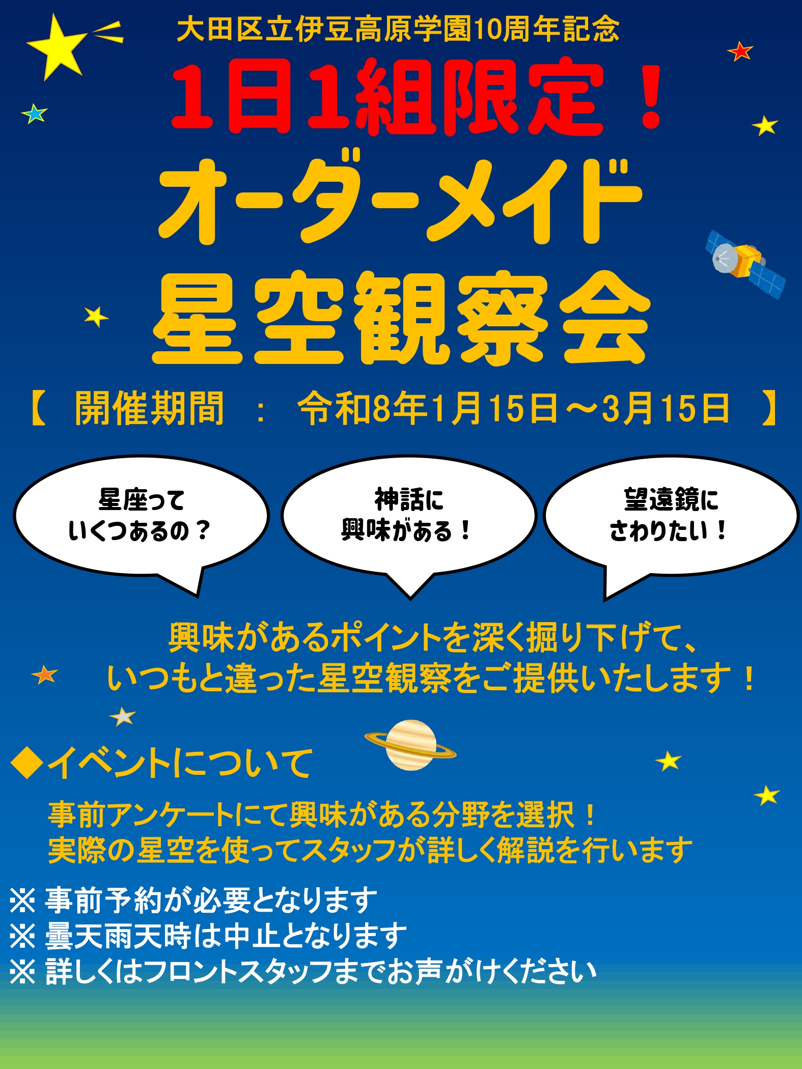 おかげさまで大田区立伊豆高原学園は10周年を迎えることが出来ました! 日ごろの感謝を込めて、1月15日から3月15日まで1日1組様限定で、 人気アクティビティ”星空観察”のオーダーメイドイベントを開催いたします♪ ★10周年記念 オーダーメイド星空観察イベント★ 開催期間:令和8年1月15日から3月15日まで 対 象:1日1組様限定 料 金:1人600円(未就学児は無料) 申 込:電話予約のみ対応 その他:お申込みいただいた際は、 事前に星空観察に関するアンケートにお答えいただきます。 アンケートは、星空観察に関するキーワードが出てきます。 (星座、神話、望遠鏡についてなど) 興味関心があるキーワードを選んでいただくと、 選んでいただいたキーワードを軸に、 オリジナルの星空観察をスタッフがご提案いたします。 オーダーメイドならではの、満点の星空をお楽しみいただけます。 ご希望日に通常の星空観察のご予約が入っていた場合は、 オーダーメイド星空観察をお受けすることができません。 曇天雨天時は中止となります。 アンケートURL:https://forms.gle/nhBah8FXVJrgoFb98 アンケートQRコード: