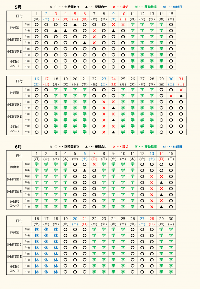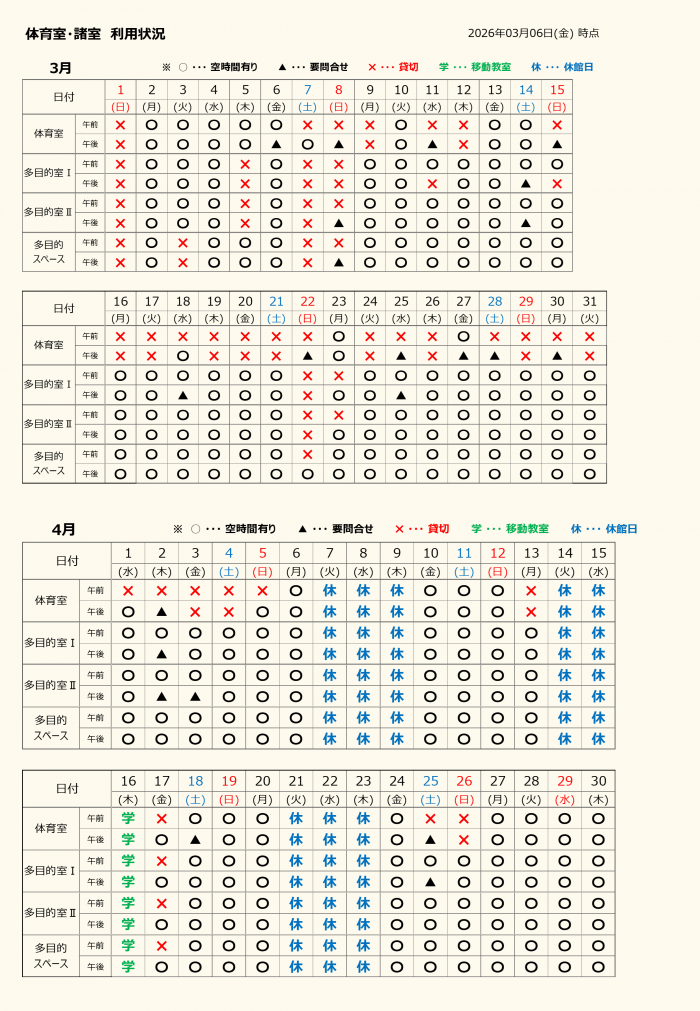 ❉ お問い合わせの多い 体育室及び諸室の利用状況をご案内いたします。 尚、本日現在の状況でございますことをご了承くださいますようお願い申し上げます。